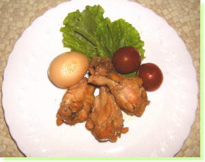 1.調味料を合わせた中に鶏手羽元を入れて、最後の段階でゆで卵を入れ少時間軽く色がつく程度煮含める。