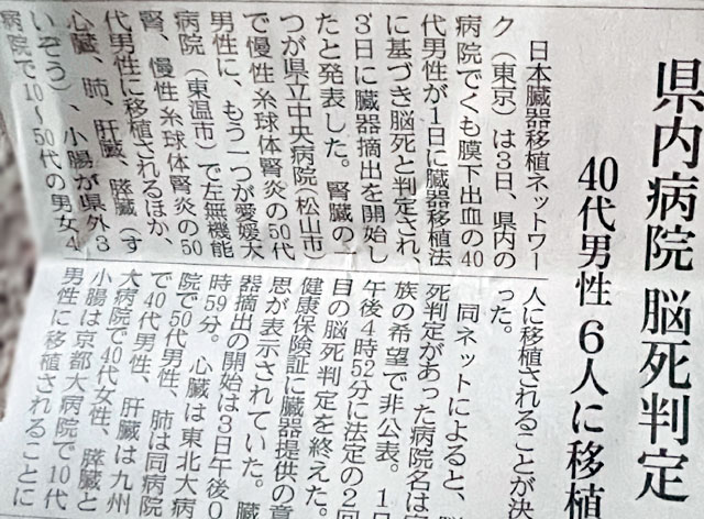 くも膜下出血で脳死と判定を受けた男性の臓器が6人に移植されるという